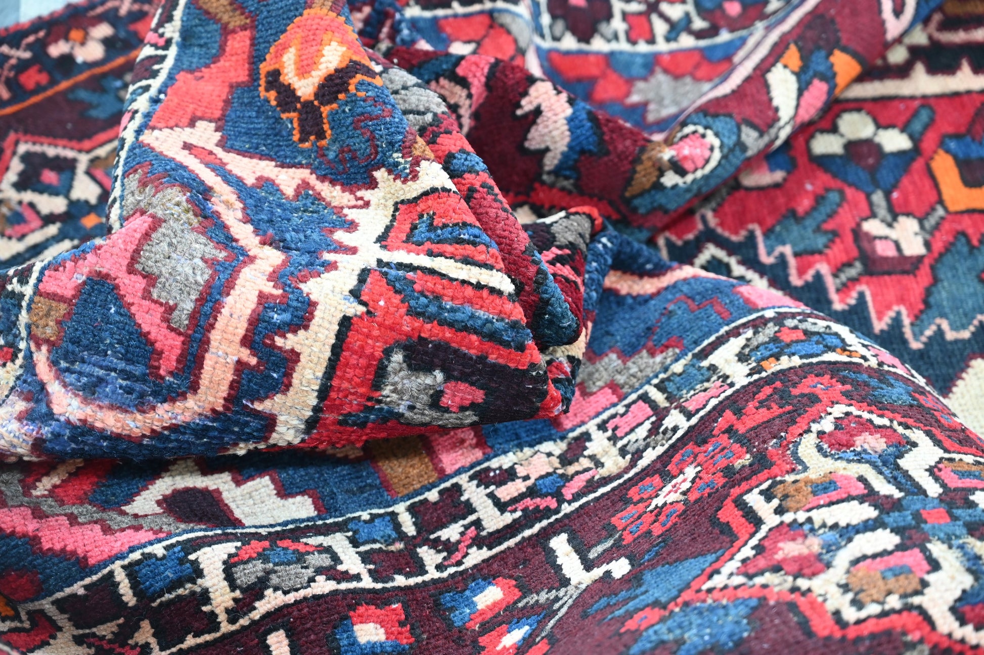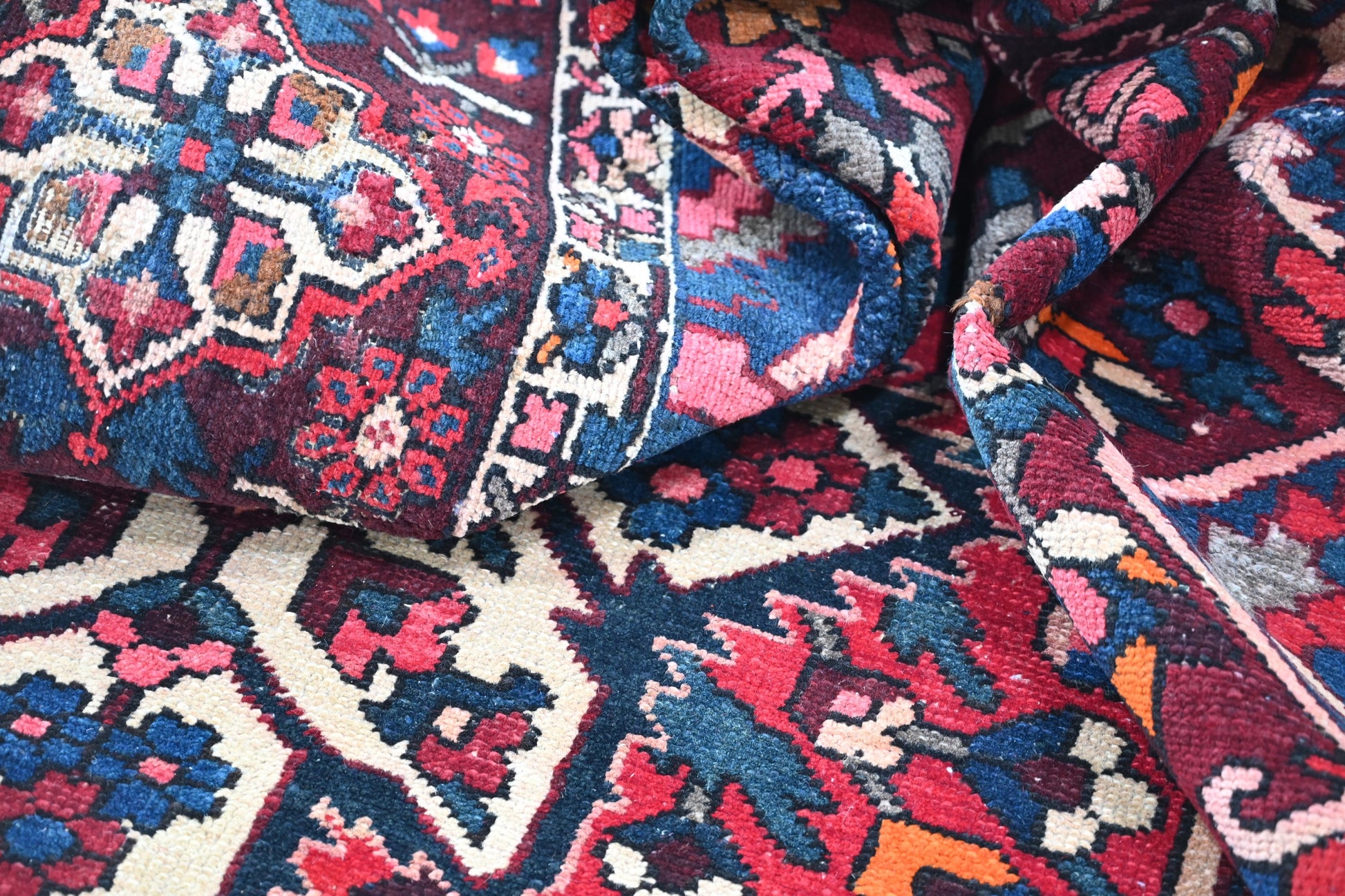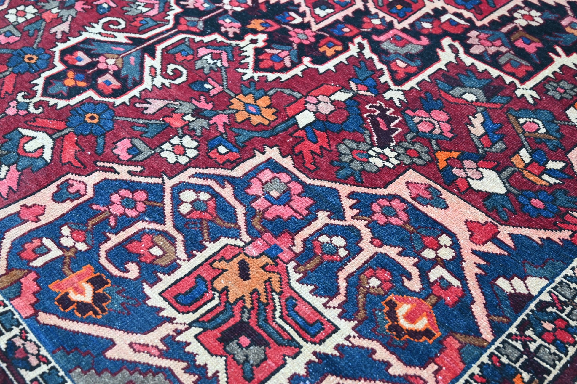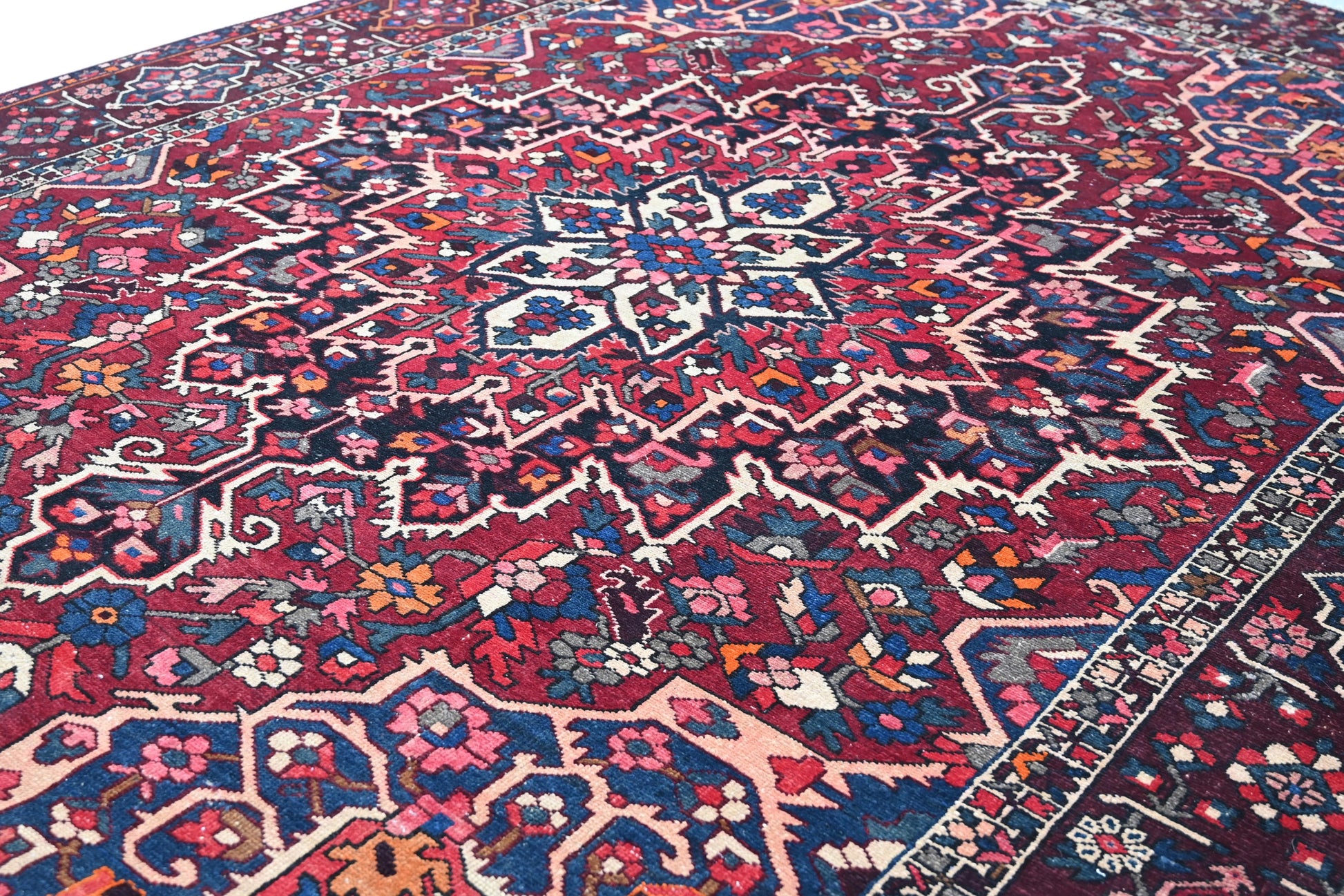 All the rugs we sell are professionally washed and cleaned; age-related wear and natural inconsistencies are inherent in these unique, handcrafted vintage rugs.